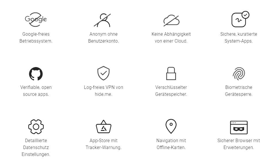 Basierend auf dem freien, quelloffenen Android ohne Google-Apps und -Dienste und ohne Abhängigkeit von einer Cloud. .
